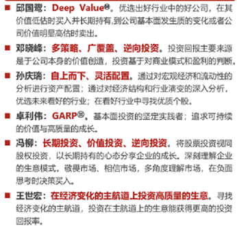 6名基金经理的投资理念和风格也各不相同,邱国鹭、邓晓峰、卓利伟、王世宏、冯柳偏向于价值投资,而孙庆瑞通过对宏观经济和流动性的分析进行自上而下的灵活资产配置。不同的投资经理多样化投资风格构建了多样化的投资体系。
