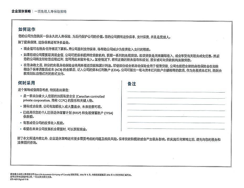 例如:有健康的身体和保险需求,45岁,男性,每年从企业的利润中投资$34,035到保险上, 企业税率50%, 投资20年,3%投资增长,每年取近$70,000, 能取到77岁。而运用个人退休策略,从66岁到85岁,每年用保单抵押贷款$70,000,到85岁时,即使减去所有贷款及利息,还可以给受益人留下$1,000,000. 参见如下Sun Life的分析说明
