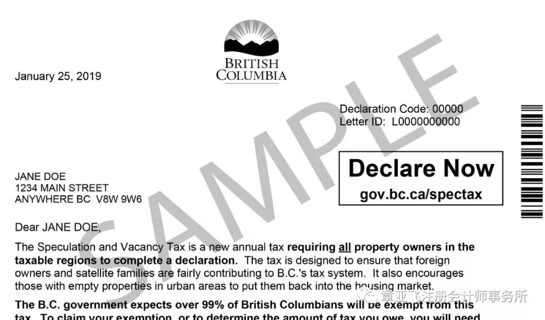 如果您在12月31日拥有住宅物业,您将会在2月中旬收到纸质的申报表。申报表上需要列出您名下的所有位于征税区域内的住宅物业,并且申报表上会指导您如何进行申报和申请豁免。申报表会寄送到您在BC评估处(BC Assessment)留的邮寄地址。