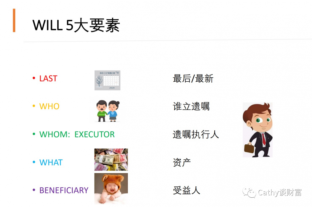 遗产规划的第一步是需要写一份WILL遗嘱,遗嘱中有5个要素,必须明确写明。
