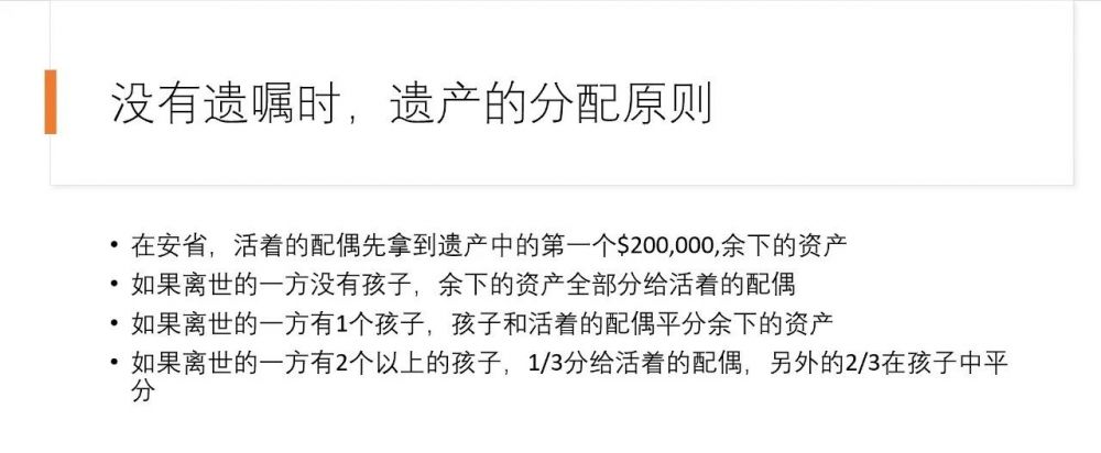 有遗嘱执行的过程都如此复杂,那么没有遗嘱的继承呢,则可能耗时数年,最终由政府根据省法律将遗产发到法律认为合适的继承人手中,在这里配偶和孩子是第一继承人,尤其配偶最重要。